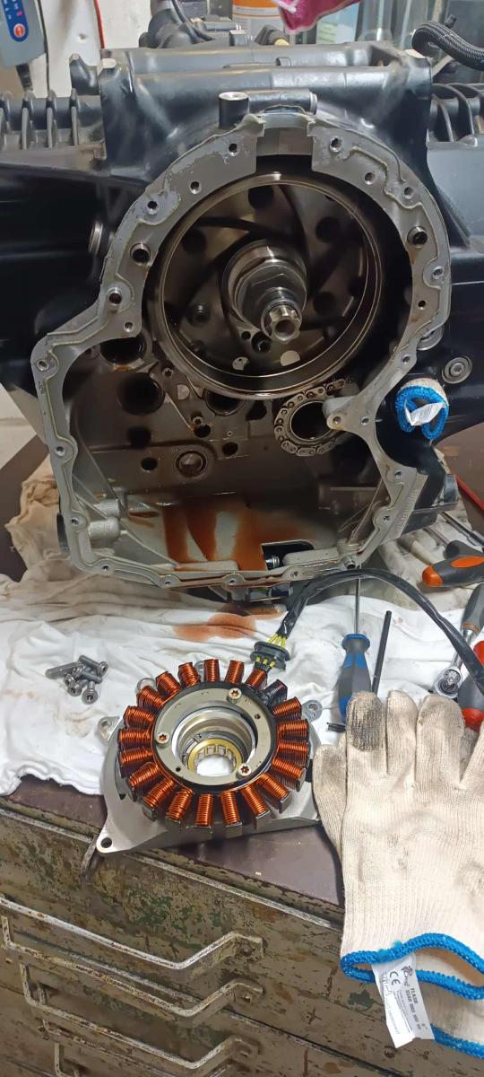 Orientační měření altíku v olejové lázni je jednoduché - odpojíš výstup alternátoru od regulátoru (3 stejně barevné vodiče) a při vypnutém motoru změříš ohmetrem jednotlivé vodiče alternátoru mezi sebou. Naměřené hodnoty musí být identické, v řádu desetin Ohmů (pokud se hodnoty rozchází, jedná se pravděpodobně o tzv. mezizávitový zkrat na některé cívce / cívkách. Následně změříš ohmetrem každý z těchto vodičů proti kostře motocyklu (naměřená hodnota musí být minimálně desítky kiloOhmů - megaOhmů). Jinak se jedná o proražení vinutí altíku na kostru.