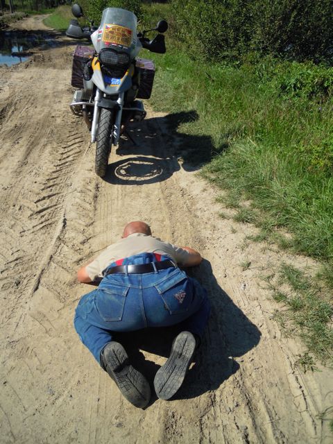 A pak po ránu se vydal na malý offroad, kolem vody... jasně za chvíli jsem ležel.. poprvé, podruhé, potřetí... Věci dolů, dostat ven motorku, donést věci... (kdo jste se tu toulal víte jaký vedro a dusno tady je)