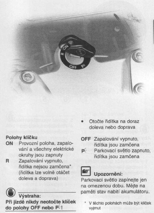 Možno mít zamčená řídítka a současně svítit parkovačkou, např. při poruše v noci u krajnice...