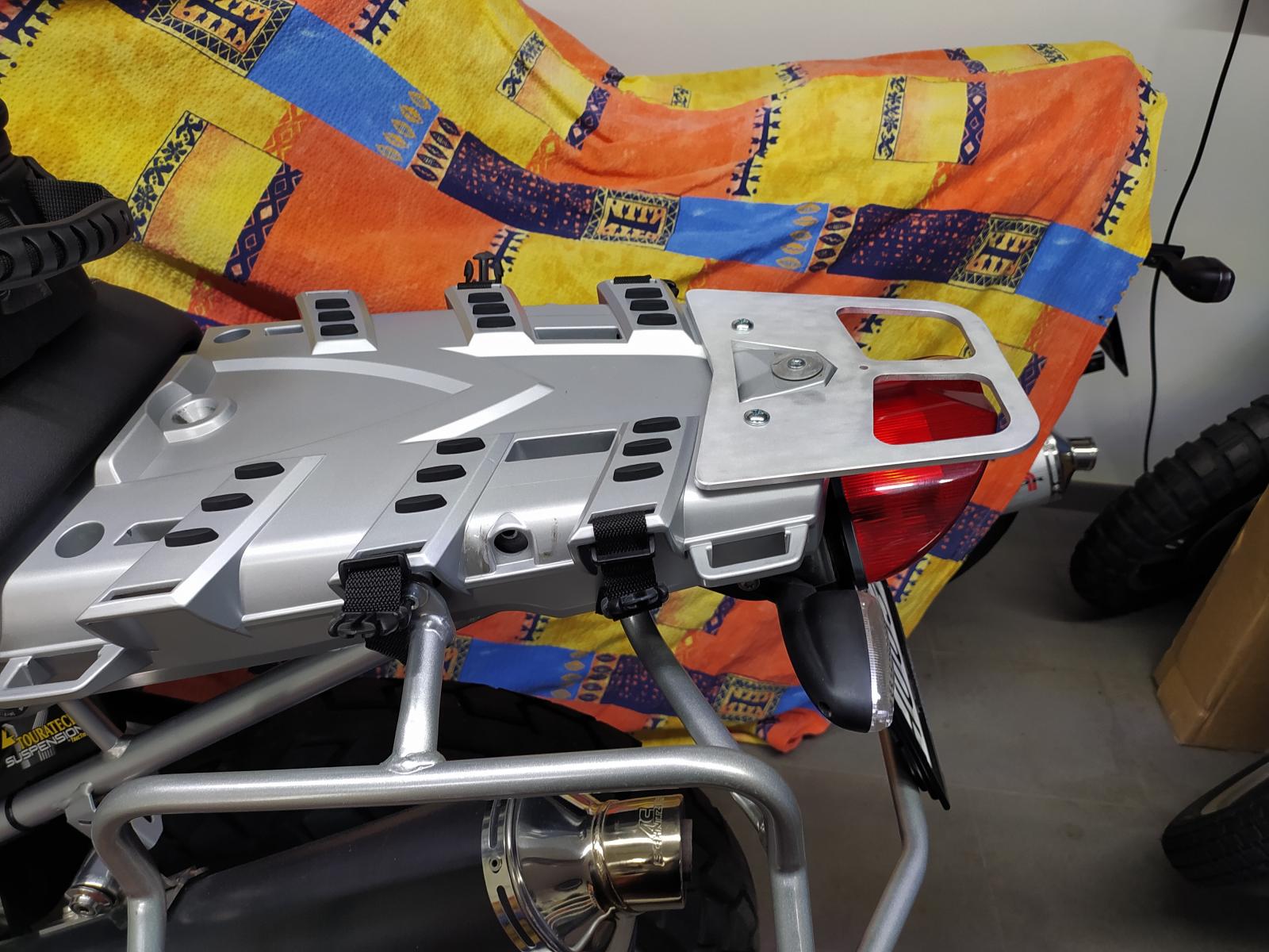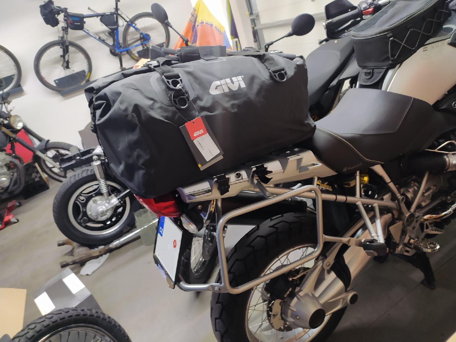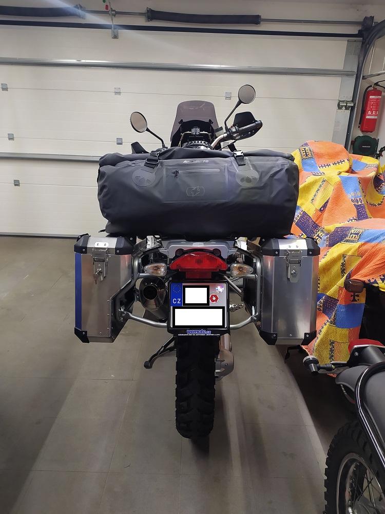 Tak jsem nakonec pořídil 60 litrovou vodotěsnou tašku od Givi - její výhoda je že má plochý spodek narozdíl od válce... a aby mi to nesedělo na světle a nehrozilo jeho poškození - tak jsem si nechal vypálit takové decentní prodloužení nosiče .