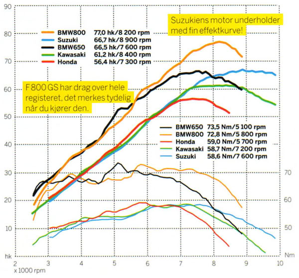 Měl bych praktickou poznámku. Četl jsem časopis, kde je srovnávací test F650 a 800GS, myslím, že nějaké Supermoto, nebo Motohouse 2009±. Byla tam i momentové charakteristiky z brzdy...proč si je nenajít. Na této z Adv.rideru je vidět, že do cca 6500 žádný velký rozdíl (narozdíl od konkurence ) není. Kdyby byly stejné koncové převody, bude rozdíl znatelný až když se to pořádně točí. Sám jsem jel pouze na 650, takže mě mrzí, že to nemůžu subjektivně porovnat, ale povězte, kolikpak točí 650 vs 800 na šestku při 100, nebo 130 km/h? (Já můžu sloužit jen s R1100GS 3600 / 100km, ca 4600 / 130km, ale to je teď k ničemu). Kdyby byly převody stejně těžké, bude mít jezdec s 650 k dispozici pouze menší rozsah využitelných otáček, tedy do dosažení 7000 srovnatelný tah. Klidnější jezdec by rozdíl nepoznal, sportovněji založený jezdec výš pak samozřejmě ano. Jsou lidé, kteří se na fóru vyjadřovali pravda u boxeru v tom smyslu, že netočí nikdy přes ca 4000. Pro takto smýšlejícího jezdce by 800 svým větším rozsahem proti 650 postrádalo smysl....Je to zase jenom o tom, kdo na tom bude jezdit. Z tohoto pohledu není 650 horší motorka, pouze je pro jinou cílovou skupinu. Tuším, že pro plnou nálož a sportovněji založeného jezdce je dobré vědět, že 650 má na předku pouze 1 kotouč. V citlivosti problém opravdu není, ale třeba v uchlazení naložený už to na závody s kamarády dolů ze Stelvia nebude to pravé.