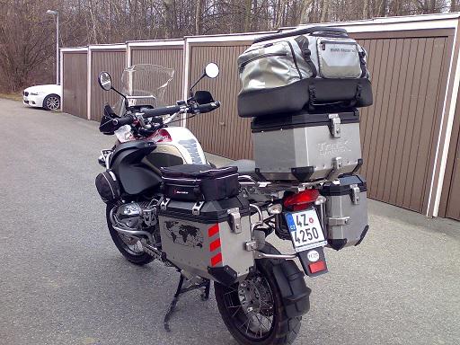 ...máš pravdu Tome : jen lehké věci (peřiny atd.). Pasuje to ale i místo kufru přímo na plotnu. Jen tam mám dodělaný takový duralový jazyk pro nasunutí popruhu na spodní straně brašny. Pak jen ty 4 original popruhy s klipsami a jde to tam a zpět velmi rychle.