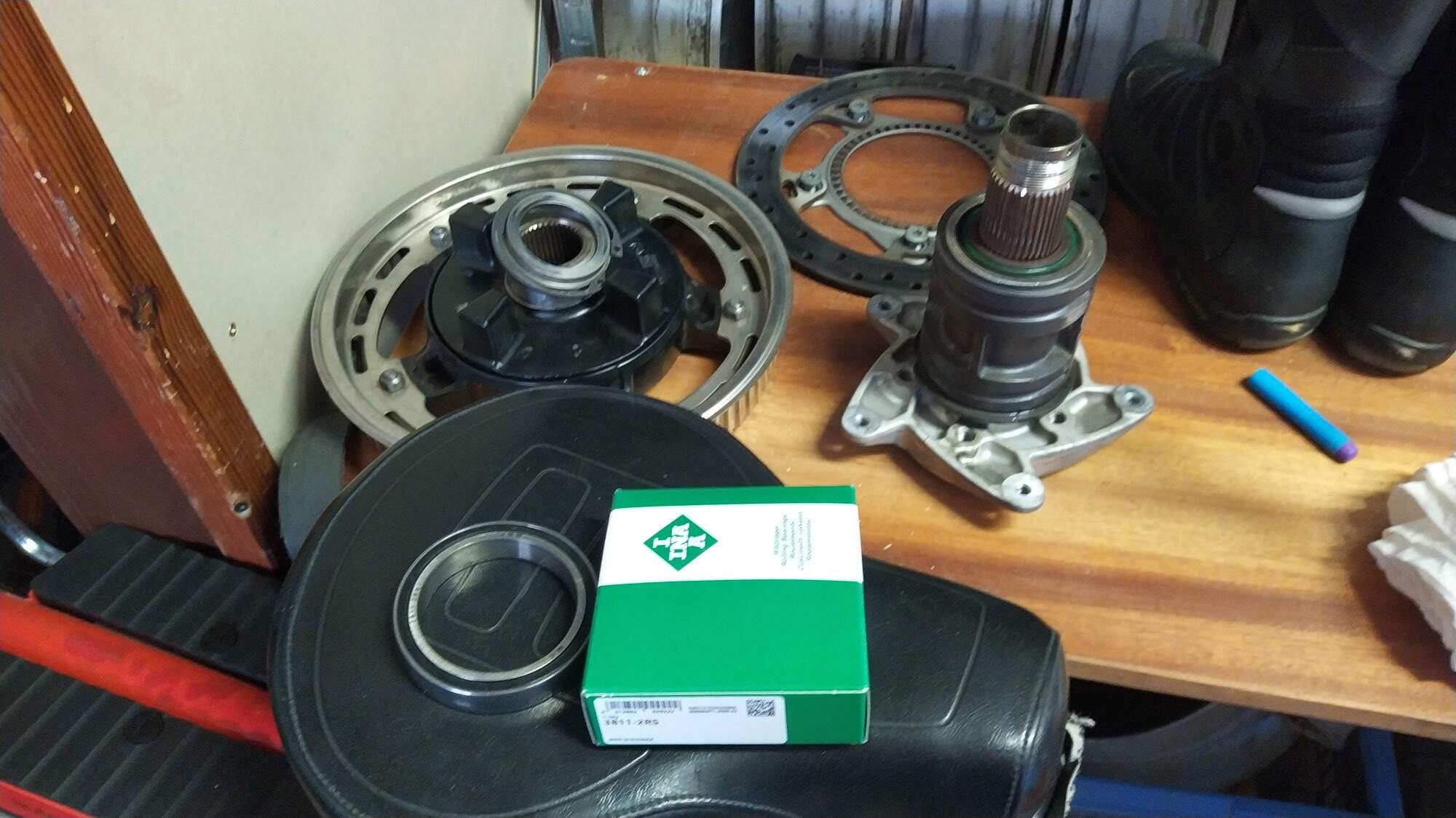 Vše proběhlo hladce, ale k montáži excentru, kterým jsem si odvezl, jsem se dokopal včera. Vůle podélná se dotažením centrální matice, předepsanými 160NM nezmenšila, zarval jsem to 190NM a nic. Ložisko asi už sedí na zápichu a šmitec a dál s tím nelze. Hýbe se celé kolo i kotouč ve třmenu což je nogood.
