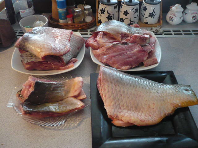 Mám taky hotovo.Včera jsem na sádkách v Žehuni koupil tři kousky.Zabiju,vykrvím,vykuchám,nestahuji zásadně.Kůže na rybě je nosičem chuti,kdo ji nejí,dá si ji na stranu na talíři.Z kapra vyhazuju jen šupiny,střevo,žluč a žábry.Jinak hlavy,ploutve a všechny vnitřnosti do polévky včetně jater,jiker a mlíčí.Do polévky přidávám i jednoho línka,má lepší chuť.