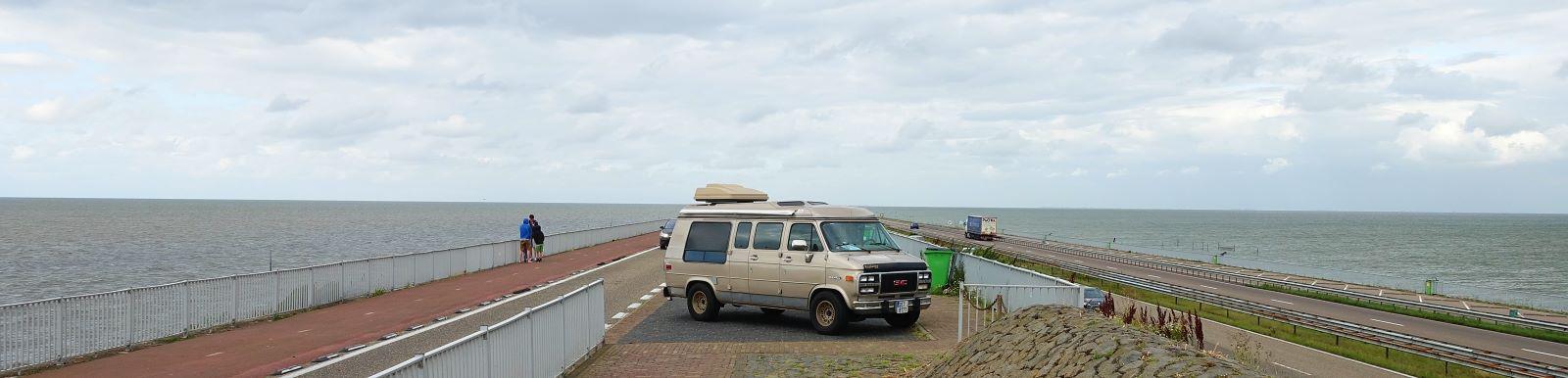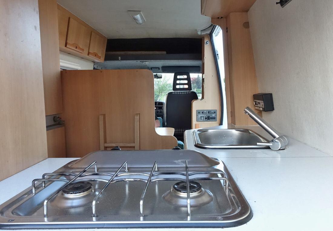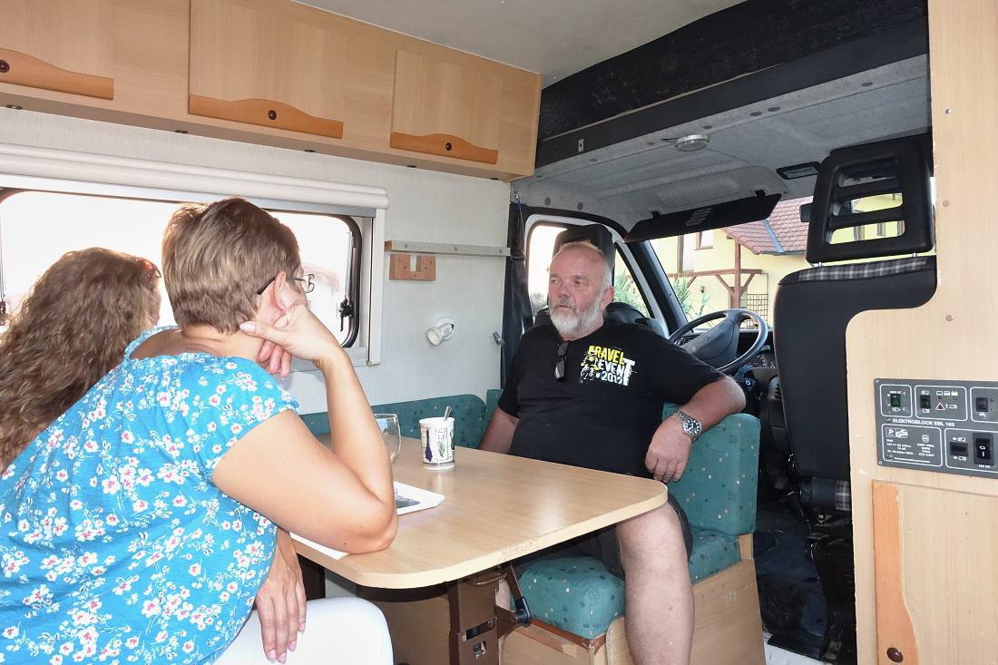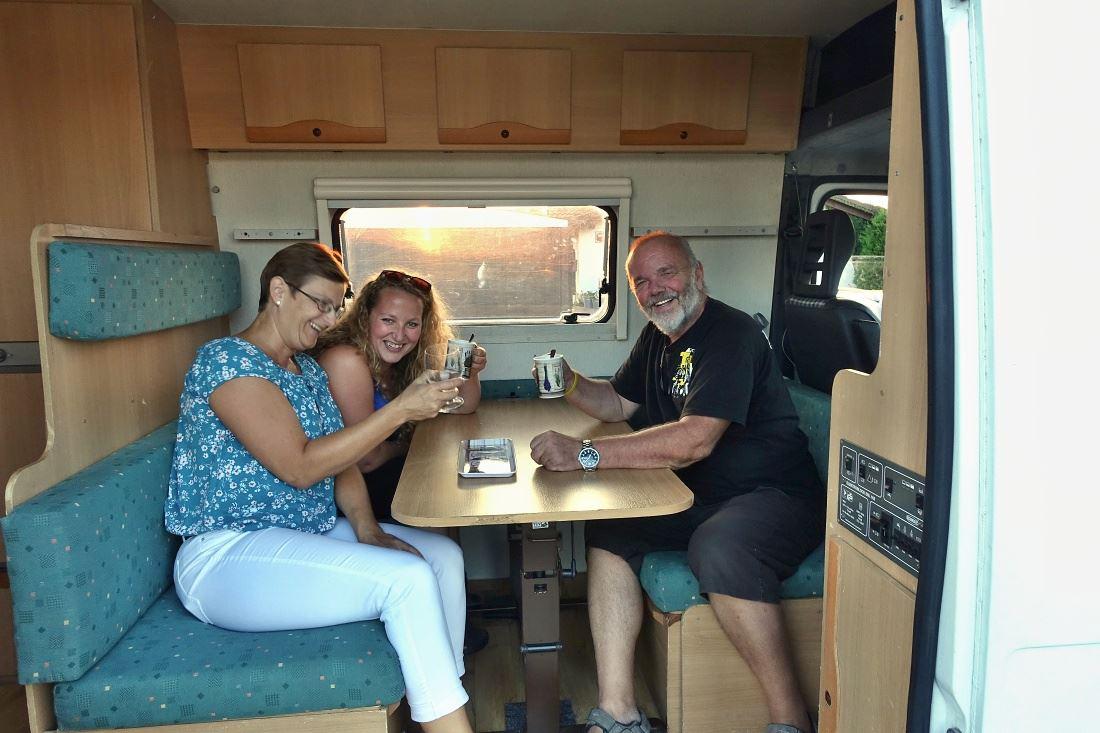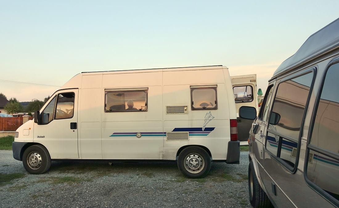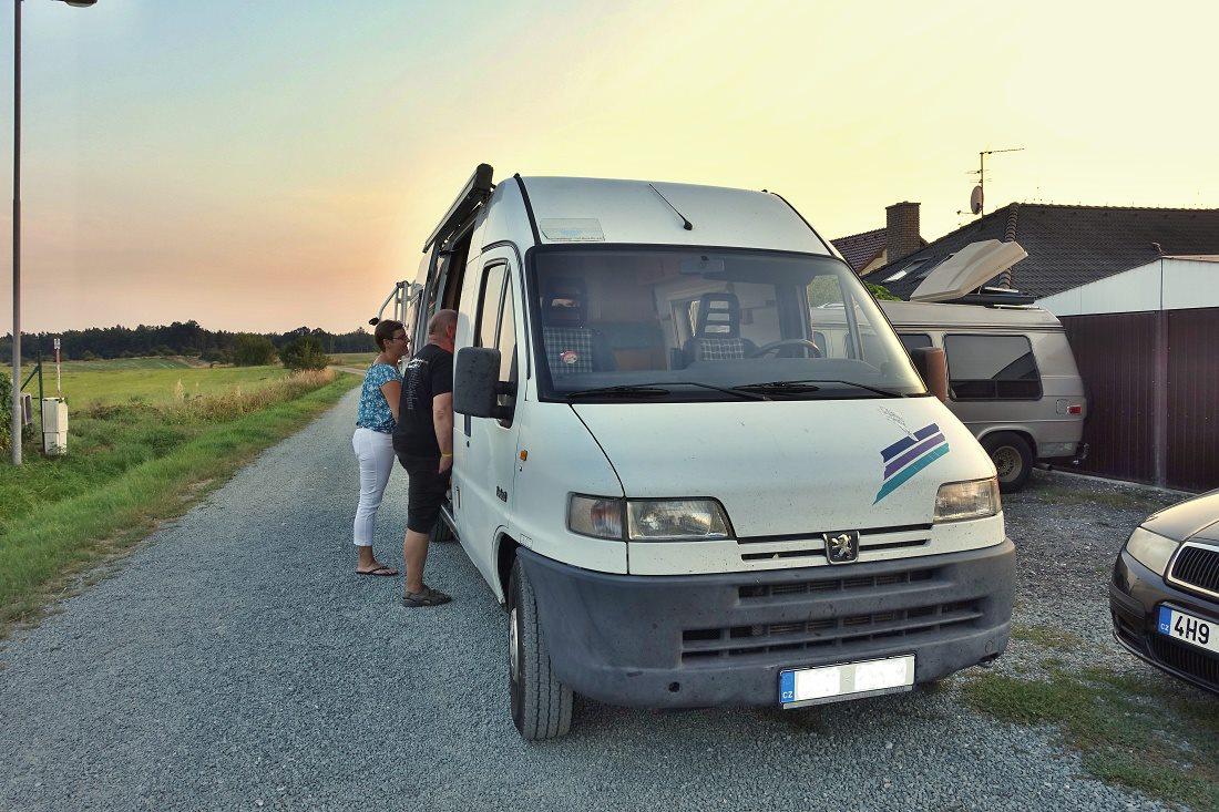 A ještě pohled zezadu. Fakt komfortní letiště vznikne v místě sedací soupravy po sklopení stolku, to nám Honza neukázal, i když se holky těšily. Ale zato jsme zjistili, že sedačka spolujezdce je otočná, zepředu se dá jít i za jízdy do zadní části auta, které má bojler, nezávislé topení, nádoby na čistou/odpadní vodu po 100 litrech, markýzu, držák na jízdní kola, všude výklopná okna s žaluziemi i síťkami proti komárům, prostě všechno pro pohodlné cestování dvou osob v nenápadném, relativně kompaktním autě. Gratulujeme Honzo a díky za návštěvu!