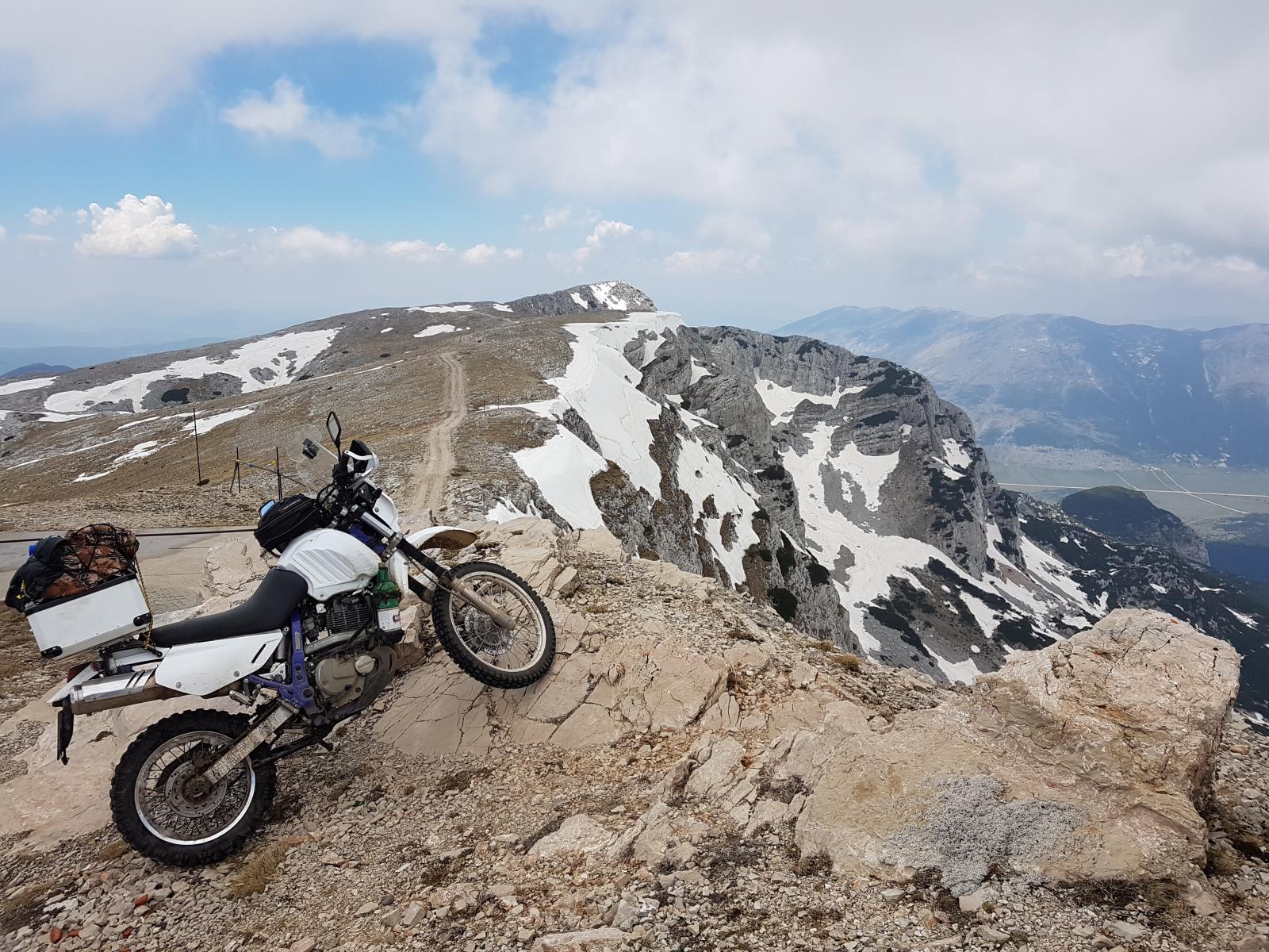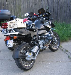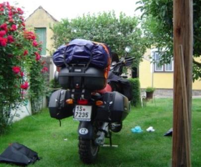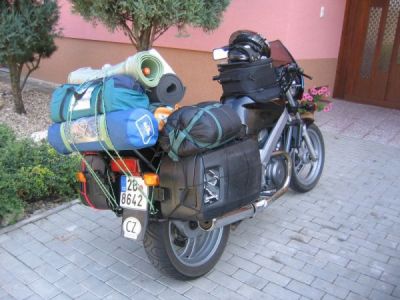 tak takhle sem byl nabalenej letos já,a už to tak nechci je to moc vysoký ikdyž tam nahoru jen samí lehký věci,a proto budu pořizovat taky hliníkový boční kufry a to 44l a nahoru jen nosič e npromokavej vak 100l a ještě si chci nechat ušít větší boční brašny k tankvaku,je paráda dostat nějakou váhu dopředu a hodně nízko