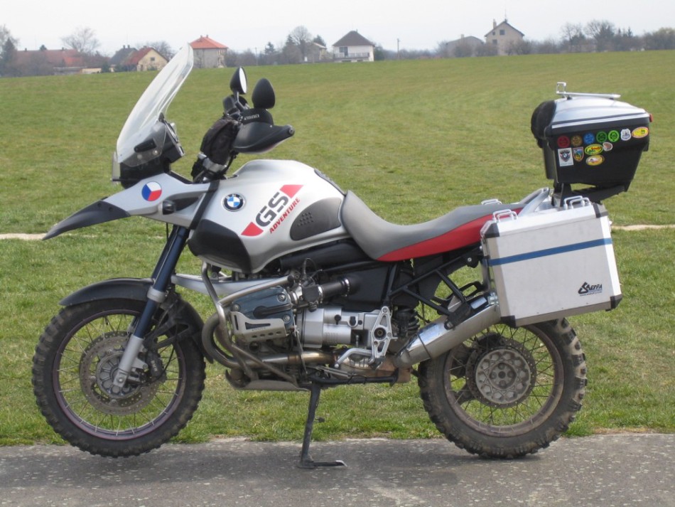Když jsem měl kufry Šerpa (klasika s puky), nebyl držák ke stupačkám uchycen vůbec. Kufry byly předozadně umístěné tak, že se téměř dotýkaly dozadu vystupujícího záchytu originál plastových kufrů a aby se nemohlysvírat k motorce, měl jsem na nich nanýtován malý úhelník "L", který se zvenku o záchyt origo kufrů opíral. S tímhle systémem jsem jezdil 3 roky včetně offroadů v Rumunsku. Kamarád ale navařil na držák trubičku směrem dopředu, kde byla zploštělá a přišroubovaná ke šroubu, co drží zmíněný záchyt origo kufrů k držáku stupačky.
