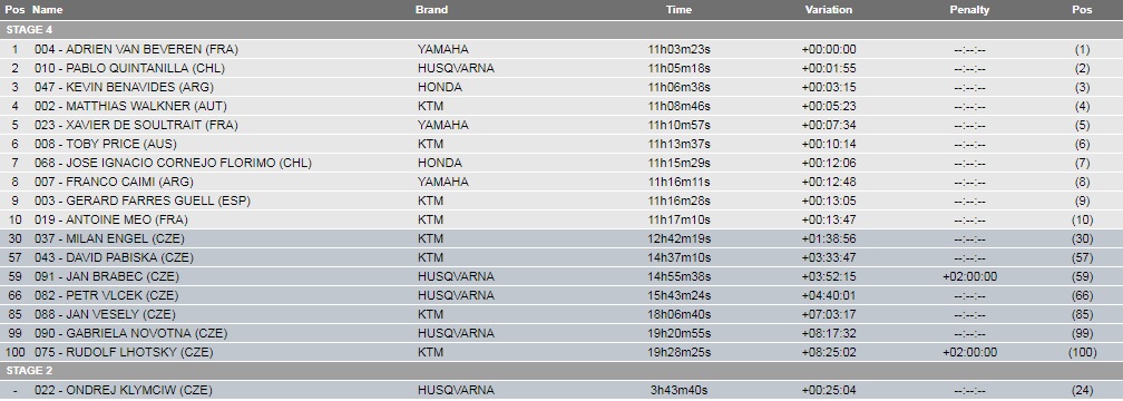 Po dnešní etapě se do celkového pořadí dostal Kevin Benavides na Hondě. Na druhé místo spadl Adrien Van Beveren na Yamaze a třetí je Matthias Walkner na KTM. Hezky se nám tak tři různé typy motorek seřadily v čele :-)