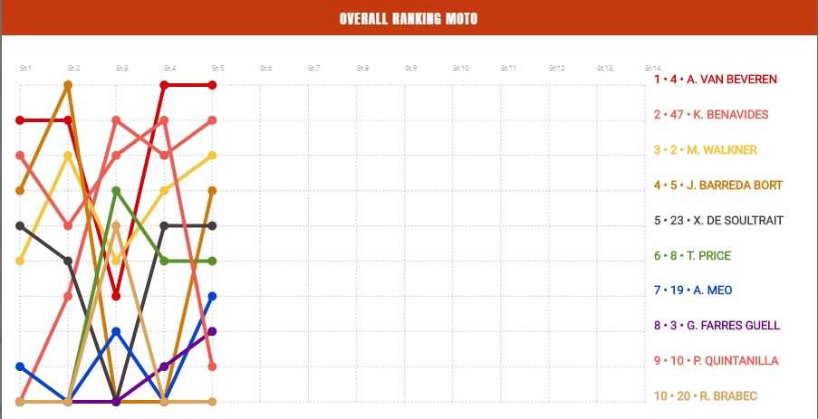 V závěru etapy se však pořadí nakonec trochu stabilizovalo, i když došlo v TOP10 k dost zásadním změnám. Tou největší je propad dosud vedoucího Barreda Borda na celkově 28. pozici.