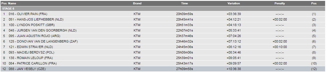 Do čela celkového pořadí se dostal poprvé letos Matthias Walkner, který dnešní etapu i vyhrál. Van Beveren, dosavadní vedoucí jezdec celkového pořadí, měl dnešní etapu dobře rozjetu a na posledním mezičasu byl dokonce nejrychlejší. Zhruba tři kilometry před finišem měl však ve vyschlém řečišti vysoké rychlosti těžký pád. Do lékařského centra jej dopravil vrtulník a vyšetření odhalilo, že má zlomenou klíční kost a poraněný hrudník a páteř.