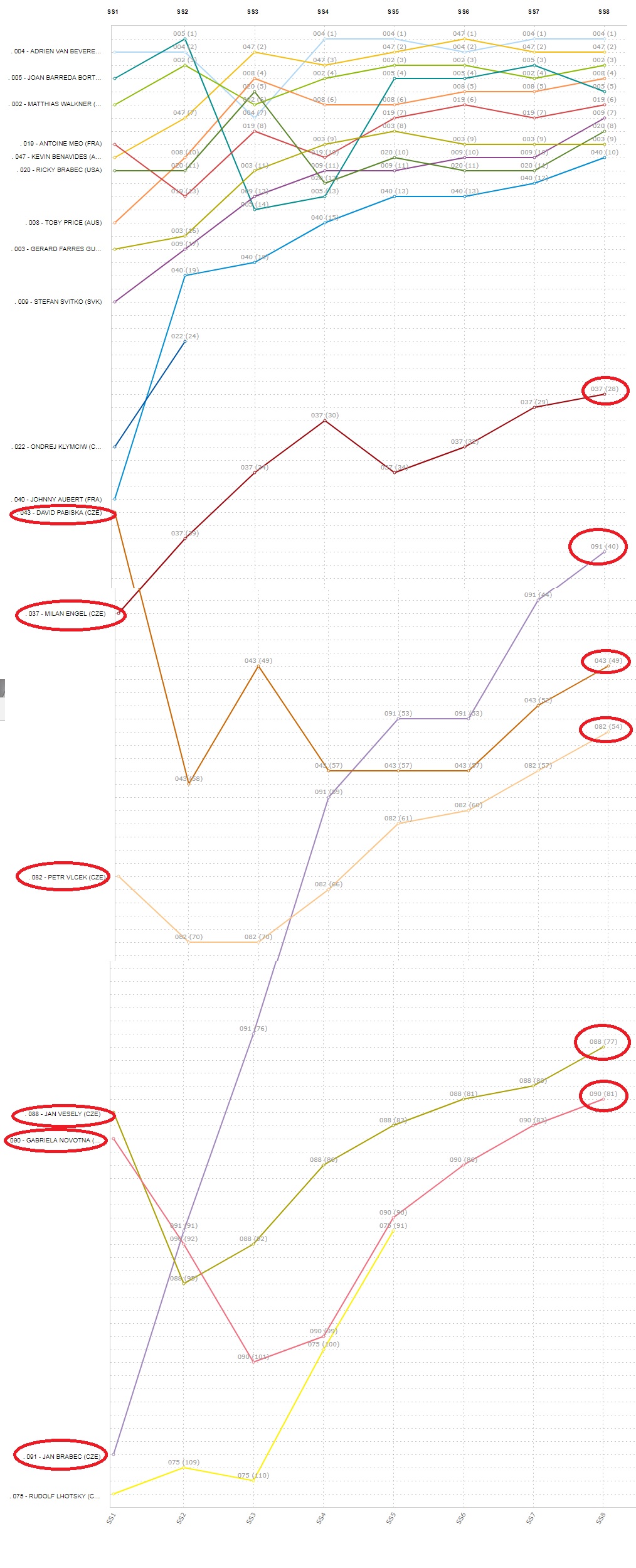 V celkovém pořadí je z našich nelepší Honza Brabec na pěkném 39. místě, David Pabiška na 42. místě, Petr Vlček je 47 a Honza Veselý je celkově na 72. místě.