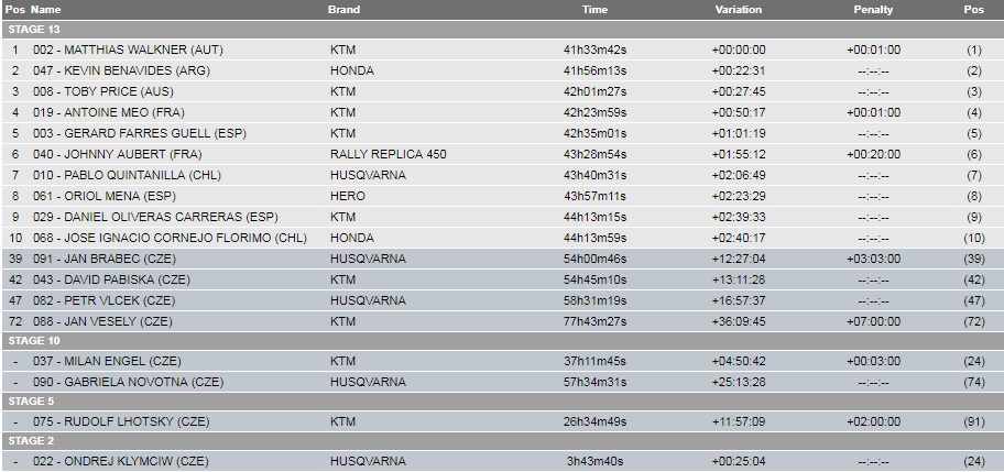 V celkové pořadí si Milan Engel, jako náš nejúspěšnější motorkář, pohoršil ze 30. místa v předchozí etapě na nynější 34. místo. Na celkové 54. místo se propracoval Honza Brabec. David Pabiška si drží svůj standard 58. místem následován Petrem Vlčkem na 61. místě. Honza Veselý, Ruda Lhotský a Gábina Novotná si i přes dnešní ztrátu více jak 3 hodiny udrželi celkově pozici v první stovce.