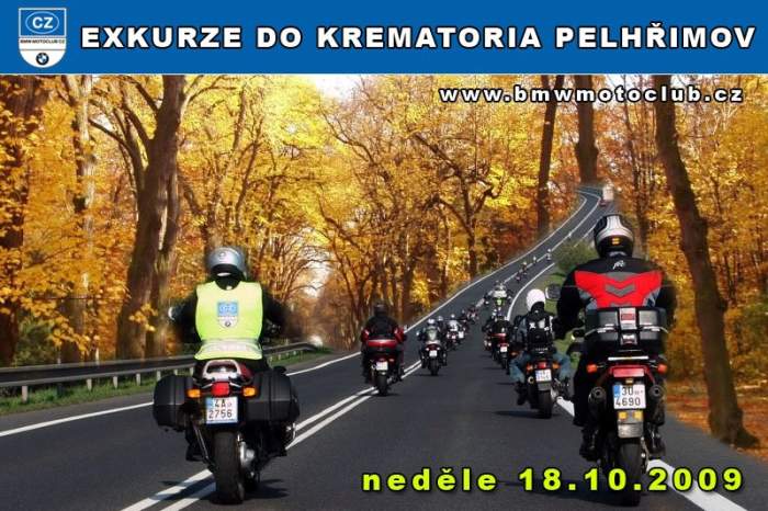 Zveme vás na loučení s motosezónou 2009, tedy na akci EXKURZE DO KREMATORIA PELHŘIMOV, která se uskuteční 28.10.2009. V rámci akce navštívíme váženého občana Hliníka v Humpolci. Pokusíme se najít krematorium v Pelhřimově. Zavítáme do Muzea kuriozit a potom zaslouženě usedneme v příjemné hospůdce k obědu. Po obědě bude následovat srdceryvné loučení a individuální odjezd domů. Počet účastníků je omezen. Místo a čas zahájení akce vám budou sděleny po přijetí vaší přihlášky. Více na http://www.bmwmotoclub.cz/aktualne/200919/.