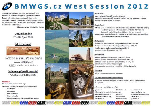 Srdečně Vás zveme na podzimní setkání členů fóra BMWGS.cz, které se uskuteční v Západních Čechách v pensionu u Jakuba od 26.-28. října 2012. Budete mít možnost seznámit se s krajem plným turistických lákadel. Programem jsou on/offroad vyjížďky, ale hlavně posezení s přáteli. Sraz lze brát jako „zakončení“ motorkářské sezóny 2012.