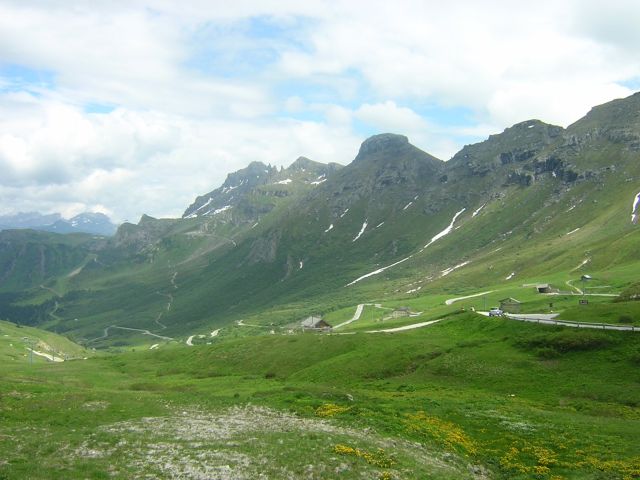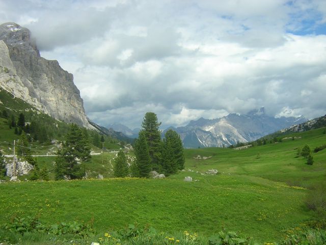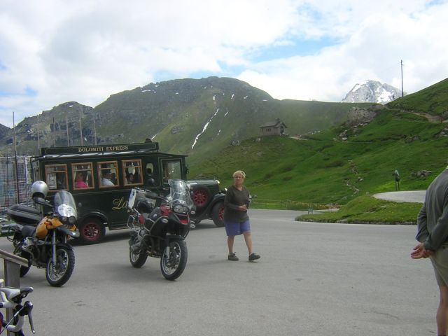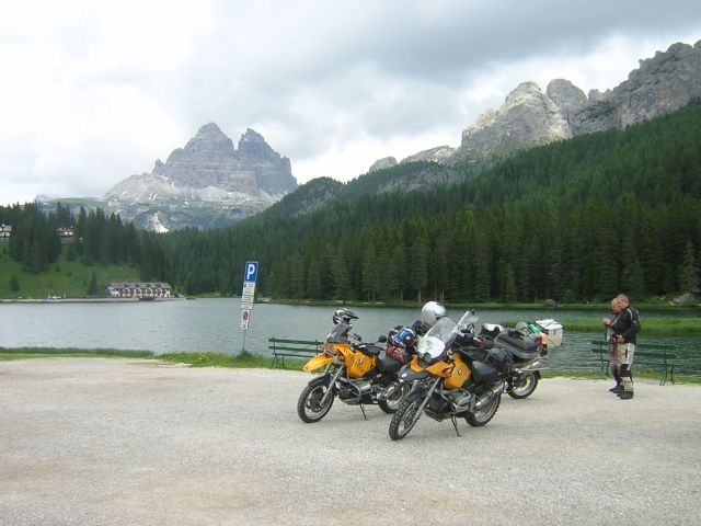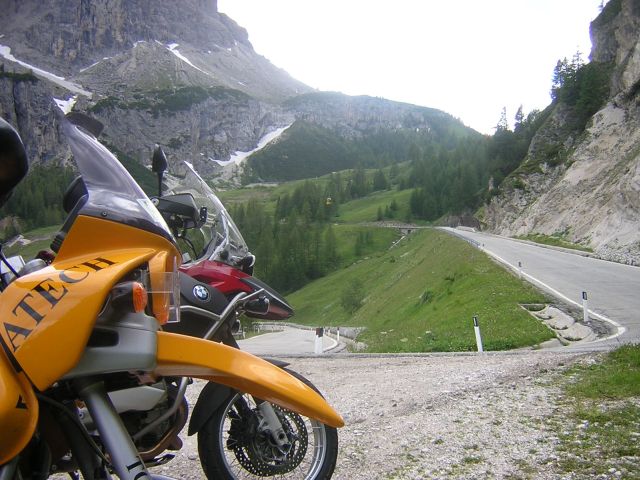 Ráno je nádherně, odjezd v 9h směr Kartischer Sattel. Cesta vede po silnici č.111 po vrstevnici údolím řeky Gail – parádní zatáčkovitý úsek. Přejíždíme přes Kartischer Sattel (1525m.n.m.) a po několika km se napojujeme doleva na silnici č. 100 k hranici A/I. Projíždíme opuštěnou celnicí a ve městě San Cándido (Innichen) odbočujeme na passo di M.Croce di Comélico (1636m.n.m.), pak doprava na passo S. Antonio nebo-li passo del Zovo (1489m.n.m.). Přejíždíme průsmyky a napojujeme se na silnici č.48 směr Cortina d´Ampezzo. V městečku Auronzo di Cadore už máme pořádnej hlad. Spravila to výborná pizza a nealko pivo. Pokračujeme dál na jezero Misurina, potom passo Tre Croce (1809m.n.m.) a Cortina. Směr Falzarego – před ním záměrně uhýbáme doleva na passo Giau (2233m.n.m.). Provoz je téměř nulový. Užíváme si zatáček a nádherné okolní krajiny. Nahoře na průsmyku dáváme malou pauzu a valíme dále přes Colle Santa Lucia, Rocca Piétore směrem na passo Fedáia (2057m.n.m.) pod masivem Marmolady. Nahoře u jezera si dáváme pauzu na kapučíno v jedné z několika restaurací. Počasí nám opravdu přeje a výhledy na okolní vrcholky jsou super. Obdivujeme výpravu asi 20-ti holanďanů v BMW Z1. Jedou krásně za sebou jako korálky dolů do Canazei. Za chvíli už mažeme za nimi. V Canazei nakupujeme v obchodě pivo a v pekárně nějaký dobroty a pokračujeme jen pár km do Campitello di Fassa, kde vím o dobrým kempu, a tak během chvilky stavíme stany. Večer jen pivo a slivovice u stanu. Jsme z těch zatáček nějací utahaní. Najeto cca 250km.