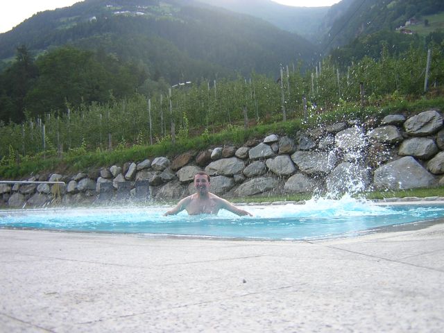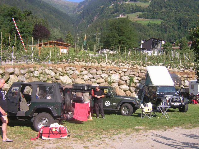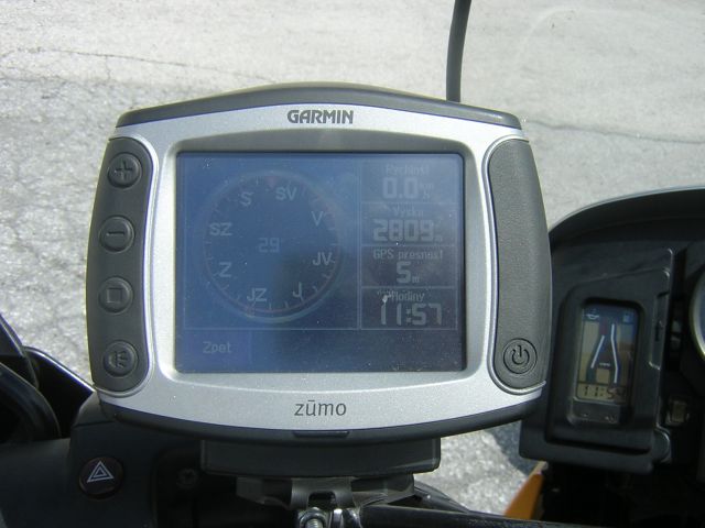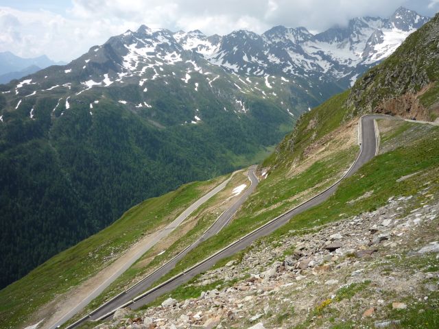 Dnes jsme vcelku rychle na nohách. Odjíždíme cca v 8,30h opět přes passo Costalunga, Bolzáno, přejíždíme přes docela „rychlý“ průsmyk Mendola (1363m.n.m.) a dále na západ směrem na passo Tonale (1884m.n.m.) Tam zastavujeme na malej oběd v jednom bufetu. Jdeme se podívat na památník obětem I.sv. války a pokračujeme dál na passo Gávia (2621m.n.m.). Výjezd na tenhle průsmyk mi dává s mojí postavičkou a váhou komára pořádně zabrat. Uzoučká silnice a neskutečné vracečky jižní rampy mě utvrzují, že je mi moje Adventůra opravdu o číslo větší a že ji asi na příští sezónu vystřídá „obyčejný“ 1200GS. Konečně jsme nahoře. Počasí opět luxusní a výhledy nádherný. Po nezbytných fotkách jdeme k motorkám, kde Puk zjišťuje, že má v zadním kole mezi špunty jeho TKC hřebík – měříme tlak a je OK. Zatlačujeme hřebík hlavičkou nadoraz – přes špunty je nad ním skoro cenťák místa a jedeme do Bormia. Tam to budeme řešit někde u benzínky, kde je kompresor, ať neplýtváme bombičkami. U jedné pumpy s autoservisem chceme gumu zalepit knotem, který máme samosebou pod sedadlem. Málem už začalo odmašlování věcí z motorky, abychom se dostali k lepení, když se nabídnul mechanik z autoservisu, že gumu za 5€ zalepí jeho knotem. Všeho necháváme – za 5€ to u nás nezalepí nikdo, a tak nám sundávání věcí z motorky odpadá. Za 15 minut už upalujeme na passo Stélvio (2757m.n.m.). Při výjezdu nám začíná slušně lejt. Nahoře na vrcholku už musíme do nemoků. Děláme pár fotek a vracíme se zpět směrem na Bormio. Po pár km od vrcholu odbočujeme doprava na krátký výlet do Švýcarska na Umbrailpass (2503m.n.m.). Přesně v místech, kde při sjezdu dolů přechází asfalt v cca 5km dlouhý šotolinový úsek prošlapuje Dr.Žák zničehonic pedál zadní brzdy nadoraz a projíždí na můj vkus vcelku rychle šotolinovou zatáčku. Vše OK – ustál to. Na následující rovině zastavuje a hledáme příčinu – diagnóza=pouští gumička v brzdovém válci. No nic. Musí to dojet domů jen s předkem. V St. Marii se napojujeme na hlavní silnici směr hranice CH/I. V podvečer dojíždíme do Merana. Nacházíme správný výjezd z města směrem na passo Rombo nebo-li Timelsjoch (2509m.n.m). Před městečkem St.Martino in Passíria jedeme do kempu. Po postavení stanů jdeme vypláchnout vlky do vyhřívaného kempového bazénu. Bazén máme celej pro sebe, tak se tam rochníme přes hodinu. Když přijdeme ke stanům nevěříme svým očím. Naše tábořiště je obležené Jeepy s českými poznávacími značkami. Jeepaři jedou na výlet na Sardinii. Jaké překvapení, když se najednou objeví Bob z cestovniendura.cz. Takže o zábavu na dnešní večer je postaráno. Kecáme, popíjíme. Kolem půlnoci jdeme spát. Najeto cca 360km.