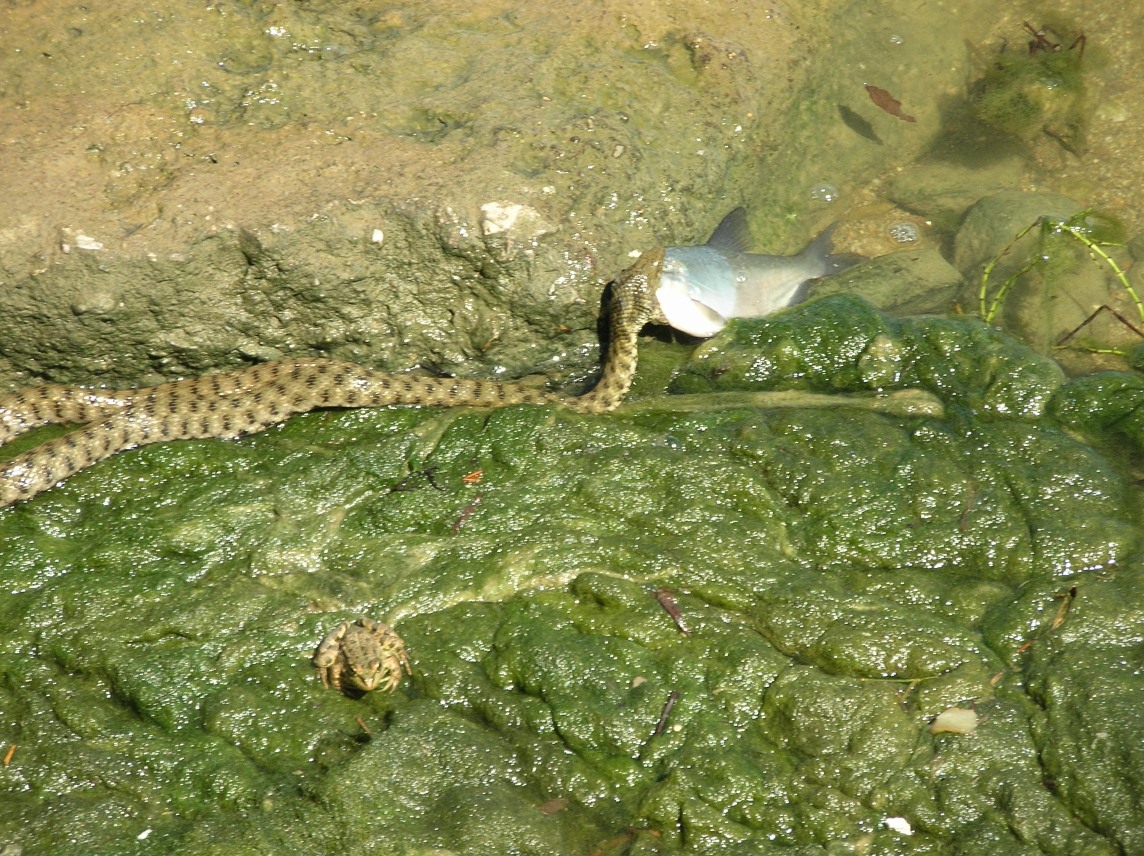 Nakonec ji ale pustí a ryba i had odplavou pryč..