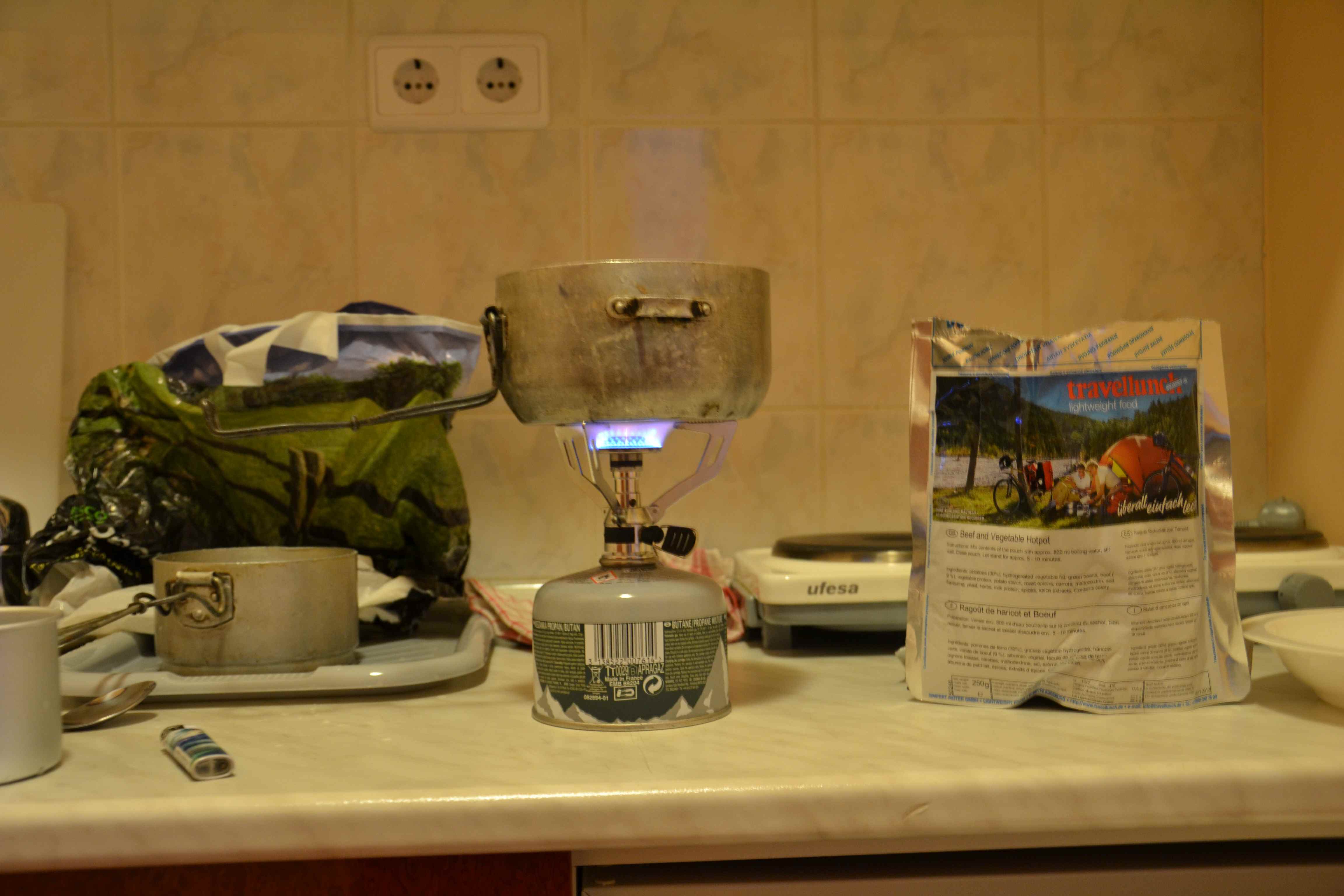 Přezto že byl v hotelu elektrický vařič, musel sem si prostě uvařit vodu na jídlo na svim. Na co bych sebou jinak tahal všechny ty trempský krámy?
